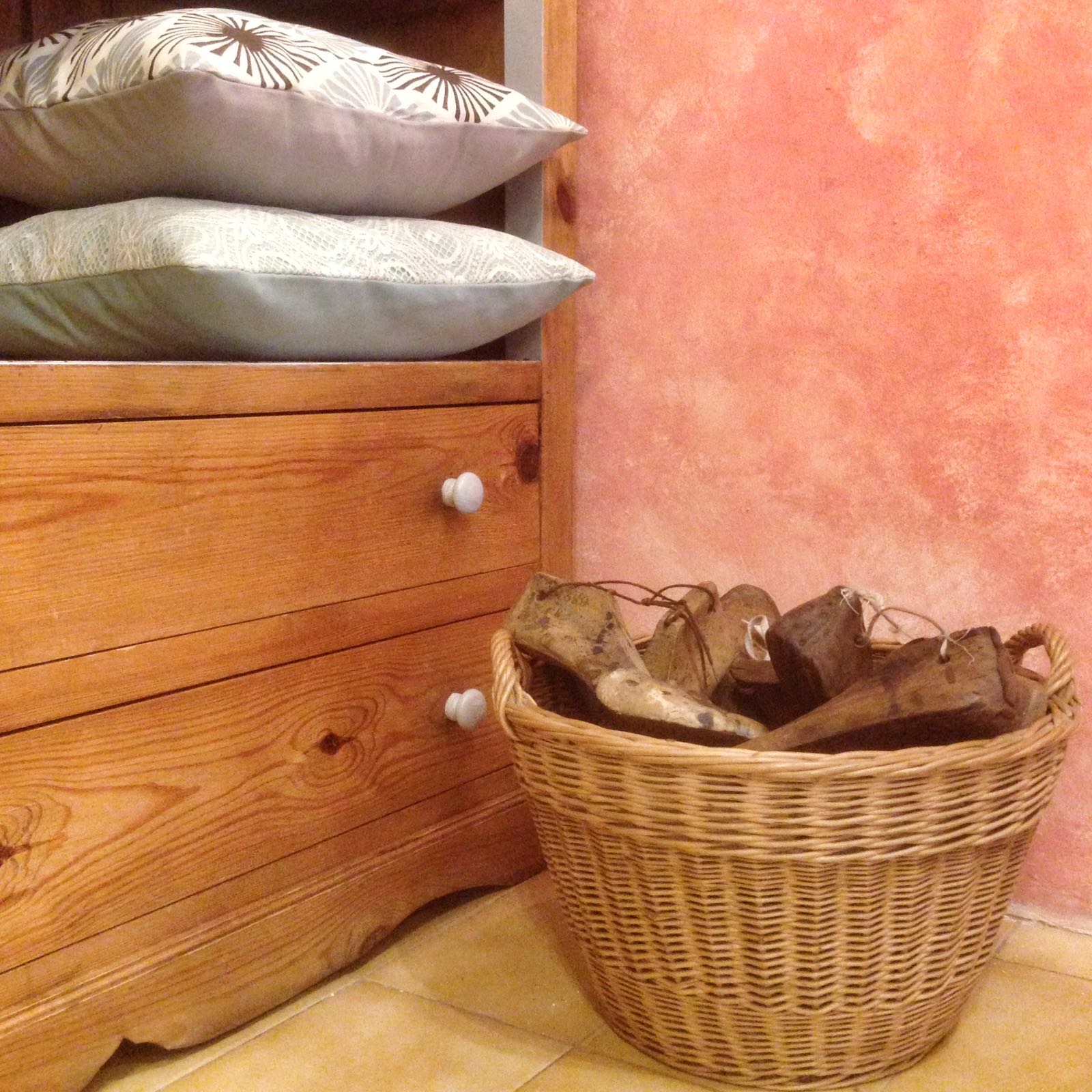 De todos modos ya sabíamos que este color, aunque es muy atractivo, no aguantaría mucho en el rincón. Ya tuvimos una sesión de fotos planeada en la cual volveríamos a pintarla. El cambio fue brutal – de un gris liso a un rosa cálido texturizado que dio al espacio un look rústico-provenzal. En los próximos fascículos de Crea y Decora podréis ver el paso a paso y los colores que componen la pared.