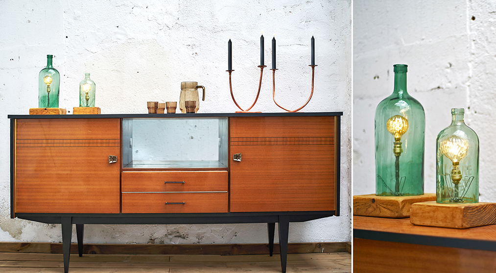 Y para el salón, como no, un mueble vintage. Perfectamente complementado con lámparas hechas de botellas antiguas sobre base de madera y unos candelabros de cobre, también de Dr. Únic.